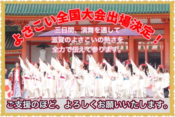 全国大会は、高知発祥のよさこい祭りが全国に広がった事をうけ、お互いの交流を深める目的で1999年に始まったそうです。本祭二日間の参加に加え、全国大会という夢のような舞台で踊れる事が現実となり、大変嬉しく、改めて身の引き締まる思いです。その歴史的瞬間を感動的なものにする為、滋賀でよさこいを楽しむみんなとチームの垣根を越え一生懸命に練習しています。