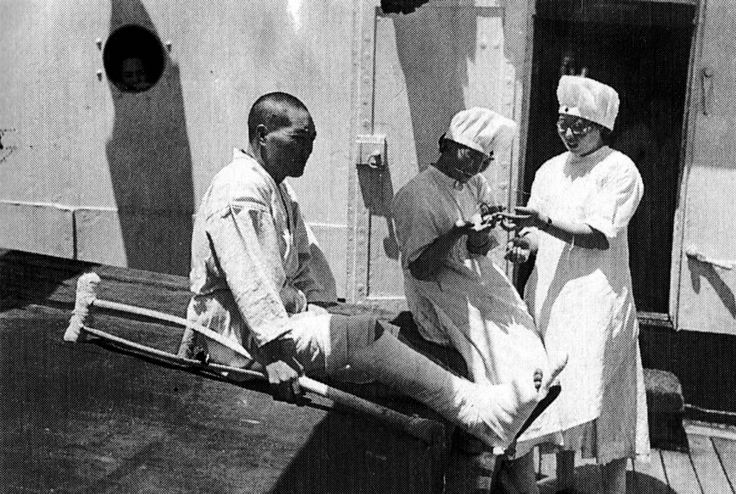 戦争時代、病院船で負傷兵の治療にあたる看護婦
