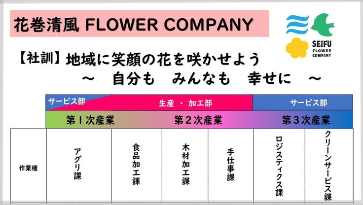 本校の作業学習は、アグリ、食品加工、木材加工、手仕事、ロジスティクス、クリーンサービスの6つの課で、これら全体を『花巻清風FLOWER COMPANY』という組織で運営しています。また、社訓を『地域に笑顔の花を咲かせよう~自分もみんなも幸せに~』とし、地元企業や地域の方のご協力をいただきながら進めています。