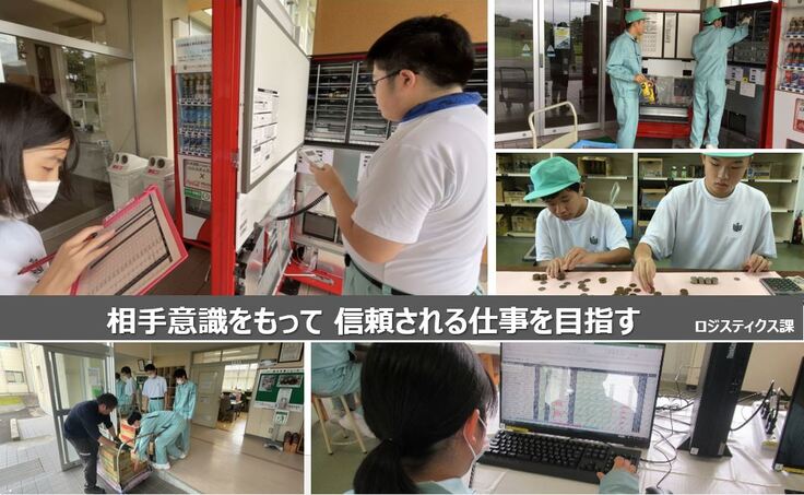 学校近くにある地元飲料メーカーの協力のもと、学校の正面玄関に2台の自動販売機を設置し、その管理運営を生徒の力で実施しています。1台の自販機につき週に1度、飲料水の売上本数や売上額をパソコン(Excel)で管理し、金銭処理をします。そして売れた数だけ倉庫となる棚からのピッキング作業をして自販機に補充をしています。ペットボトルのラベルをはがして洗い、リサイクルをする作業にも取り組んでいます。