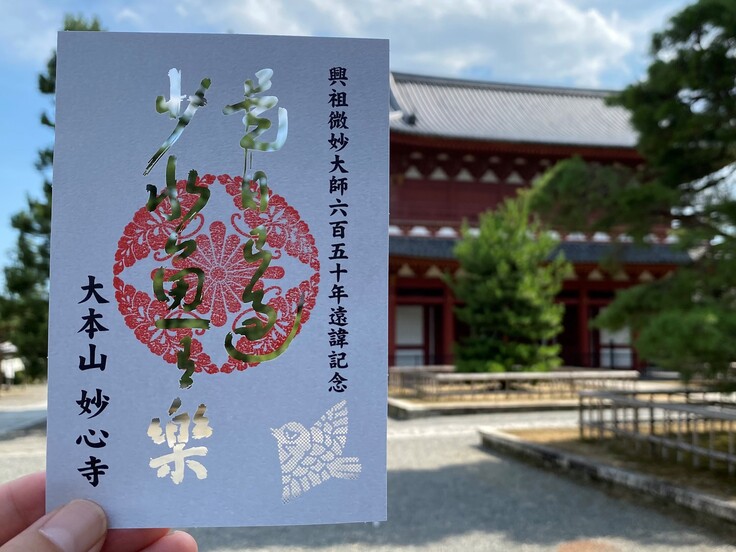 今遠諱のテーマカラーである藤色の紙に、微妙大師が遺された一行書「少水魚有楽」「是日已過」と、微妙大師の前半生と伝わる萬里小路藤房卿の家紋に舞う雀を切り絵であしらった御朱印となっております。