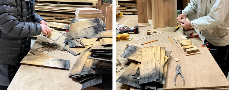 「限定御守り」は、大庫裏屋根の葺き替え工事にて取り外した杮(こけら)板を内符として納めます。そこで、岐阜県山県市の中野木材様にご協力いただき、杮板を内符に加工する作業を行いました。永年にわたって風雨から妙心寺を守り続けた屋根の杮板が皆様をお守りすることを祈念してお作りいたします。