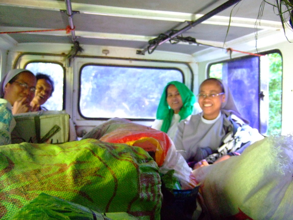 (たくさんの支援物資とシスターとお手伝いさん。現場に行くのはシスターたち)