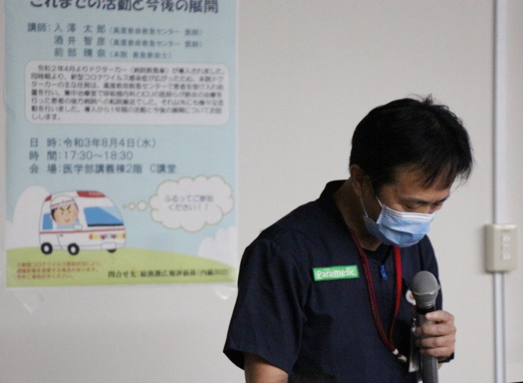 阪大病院では、院内の医師、看護師、医療スタッフをはじめ、院外の弁護士やその道のスペシャリストを講師として、様々なテーマについての講演会を開催しています。記念すべき第222回の阪大病院フォーラムでは、導入され1年が経ったドクターカーのこれまでの活動と今後の展開について、救命センターの医師と救急救命士の3人で講演をさせていただきました。