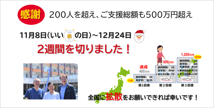 いつも私たちのプロジェクト「視覚障がいのある方に「触ってわかる」歯の模型で「建口」を!」への応援をいただき、ありがとうございます。おかげさまで、ご支援いただいた方の人数が200人を超え、ご支援総額も500万円を超えました。ご支援くださったお一人お一人に、心より感謝申し上げます。皆様からいただいた応援、ご期待にしっかり応えることができるよう、頑張って参ります。
