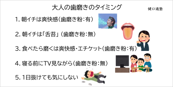 さて、今回の「健口適塾」は「大人の歯磨き」のタイミングのお話です(完全に私見です)。