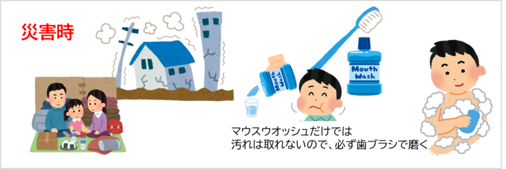 災害時、水は貴重です。歯磨き粉を使った歯ブラシは出来ないことが多いと思います。そこでモンダミンやリステリンのような泡立たないリンス系の洗口剤を日々お使いになり、災害時、それを使うとよいでしょう。歯ブラシの毛先を洗口剤に漬けて湿らせ、続けて「水歯磨き」的に歯ブラシを行ってください。最後に残りの洗口剤を口に入れて「ブクブクうがい(風邪予防の喉のガラガラうがいではありません)」をすればよいでしょう(歯磨きをしない、洗口剤でのうがいだけで歯垢は取れません。必ず物理的な歯ブラシ刷掃が大事です)。