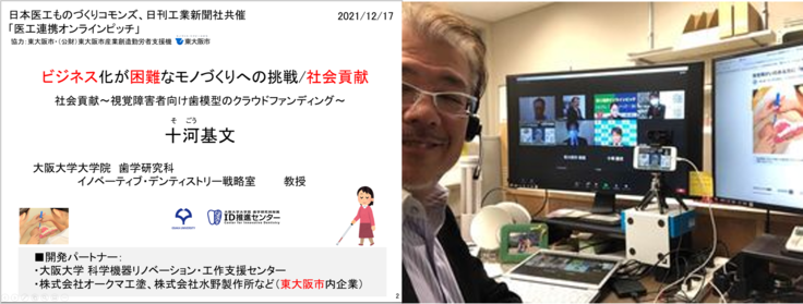 昨日は大阪大学(歯)と歯工連携協定を締結し、また今回の「歯模型」作製においても市中企業様にもご協力頂いている「東大阪市」にお声がけを頂き、日本医工ものづくりコモンズならびに日刊工業新聞社が共催する(協力:東大阪市)「第17回 医工連携オンラインピッチ」で、「歯模型の試行錯誤の苦労話」を短い時間の中、たっぷりさせていただきました。