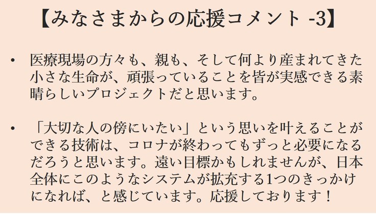 赤ちゃんとご家族が会える、宝物の時間を提供できる環境づくりを心から応援しています。ぜひ実現させてください。