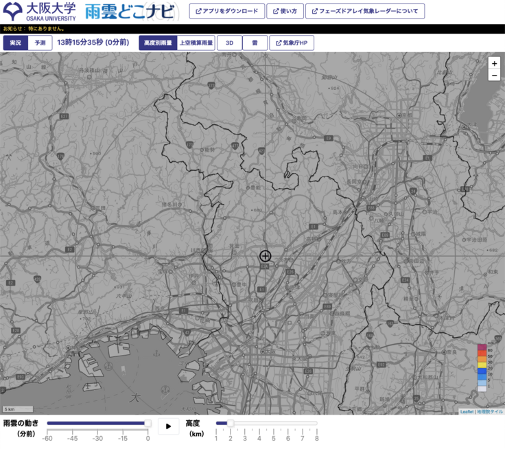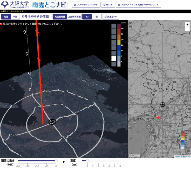 「雨雲どこナビ」のテスト版が出来上がってきました!フェーズドアレイ気象レーダーで取得された雨雲の様子を2次元・3次元でご覧いただけます。(しかし最近は雨が少なく、テスト画面も少々寂しいものがありますが...)
