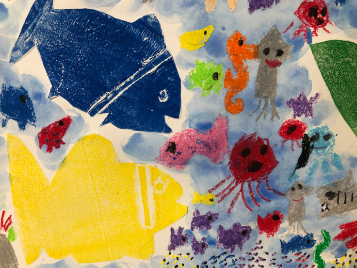 その絵はたくさんの海の生き物を画用紙いっぱいに描いた絵です。