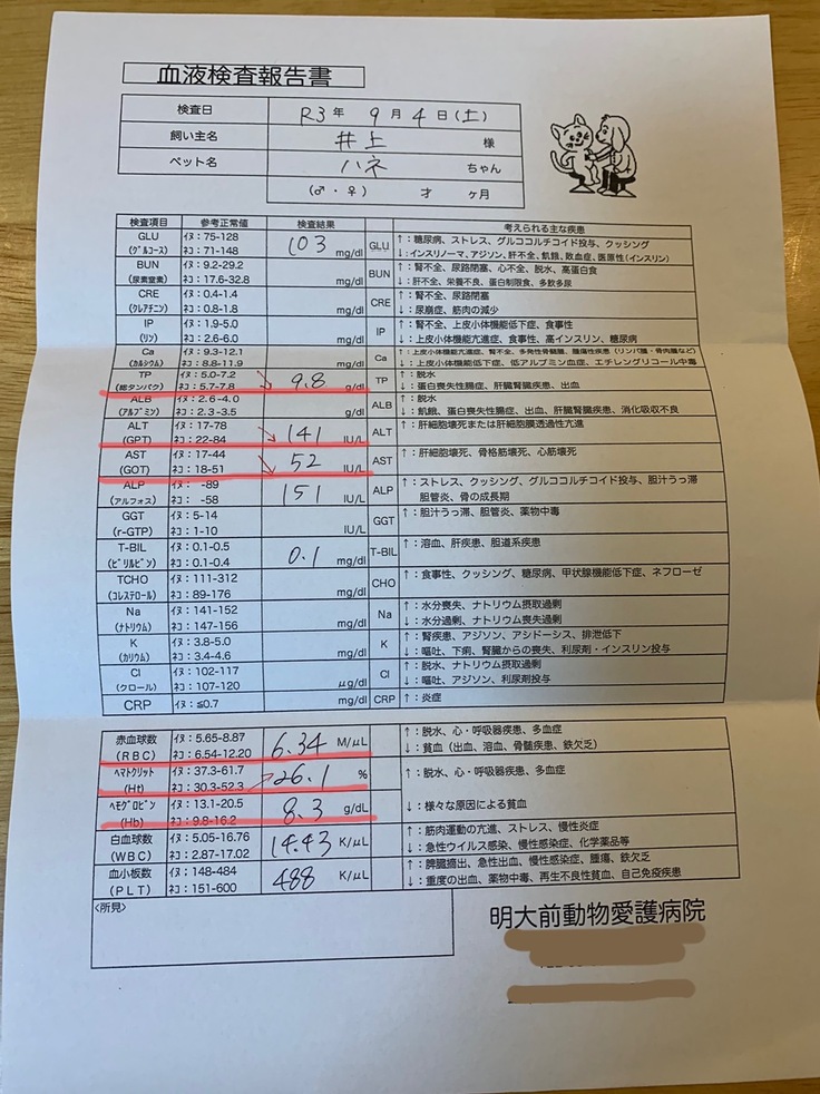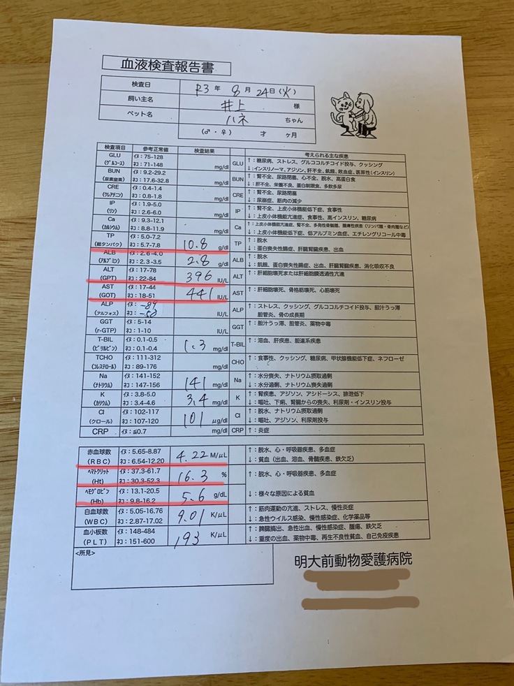 血液検査では肝臓機能の数値(TP,ALT,AST)が異常に高く、