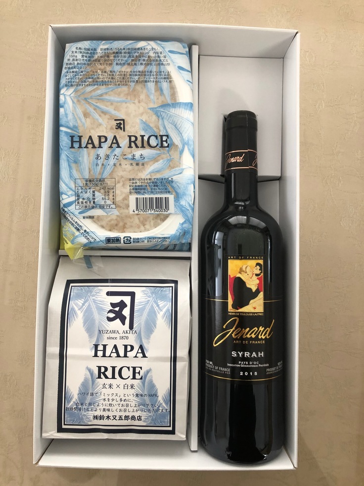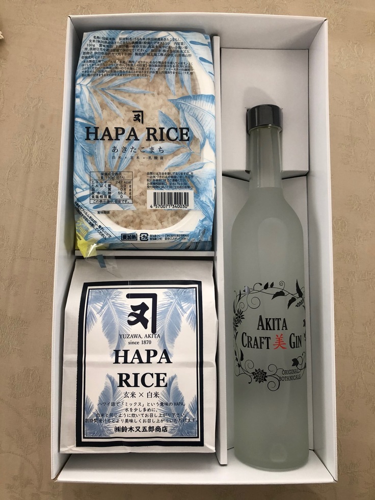 レトルトごはん×3、ハパライス×1、クラフトジン×1の5千円セット。