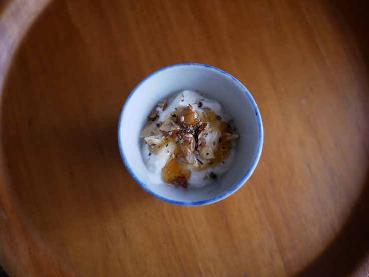 朝食やデザートに!プレーンヨーグルトに、香ばしい砕いたナッツと甘美な蜂蜜をトッピング。仕上げにハッパローギをふりかければ、風味豊かな大人の味わいに。混ぜて食べても、そのまま味わっても◎。食欲がない時でも、幸せ感じる一品に。