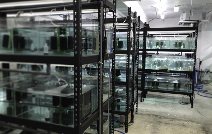 現在、稼働している水槽は1階に大型水槽一台と水槽が126台、2回には小型の水槽が54台
