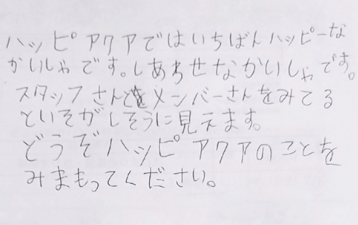 最期にハッピーアクアの利用者さん自ら書いてくれたメッセージで終わりたいと思います。