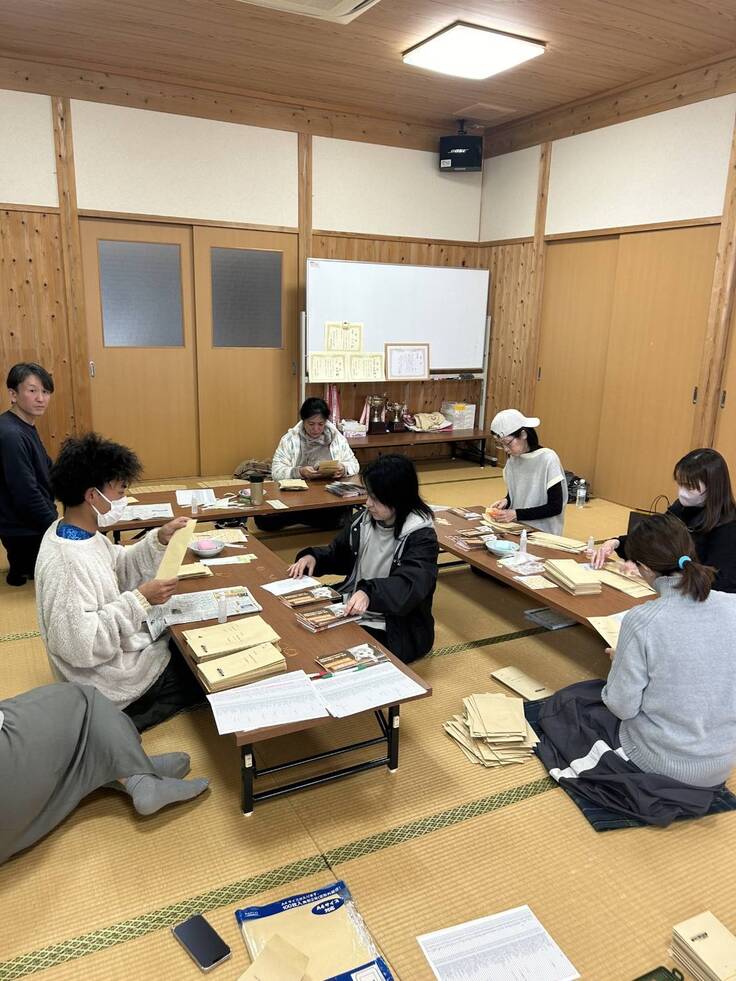 写真は、近所の公民館での封入作業のひとコマです。
