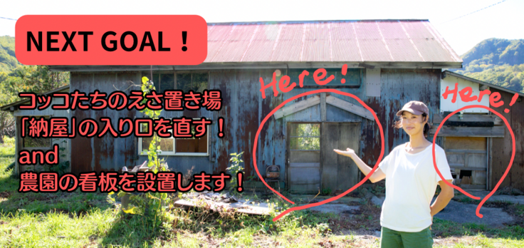 もし、もう少しご支援いただけるなら、①コッコたちの餌を保管している「納屋」入り口ドアの改修、②ハッピープレイスの看板制作費に使わせていただきたいと思い、ネクストゴールを設定させていただくことにしました。