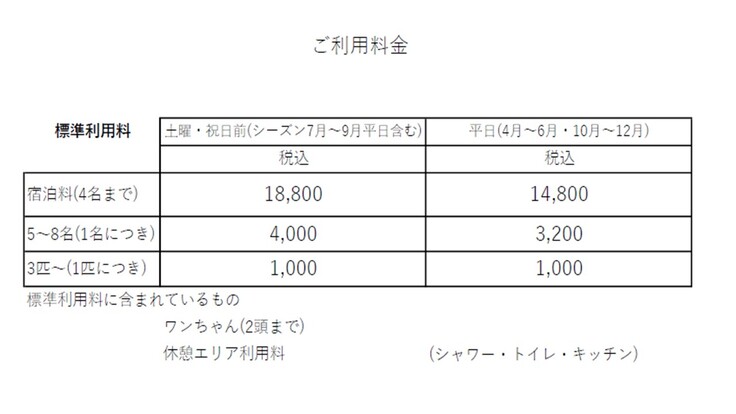 4名様まで、土曜日・祝日前18800円(4700円/人) 平日14800円(3700円/人)