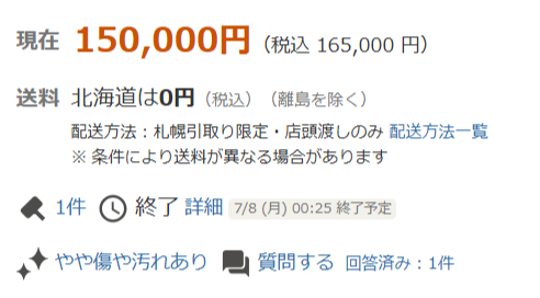 165000円で札幌でありまして、オークション終了が7/8でしたので、予算の範疇であったので、すぐに佐川急便に連絡し、冷蔵庫運搬お願いしたいということでお見積に6日ほどかかりまして、その間にすぐに入札を行い、7/12に引き取りに行きますというのが決まったのが7/10でした。(運搬費用55000円税込)