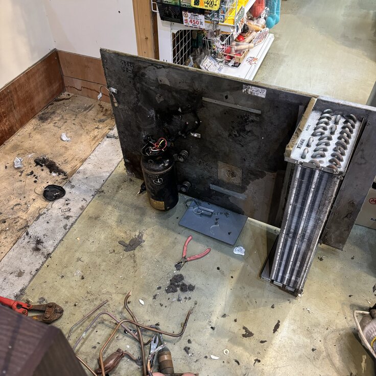 この左の小さいボンベのようなコンプレッサー部にフロンガスが入っていると産廃扱いになり、どこだり捨てれないようです。幸いにすでに黒い煙を出して吐ききっていますw