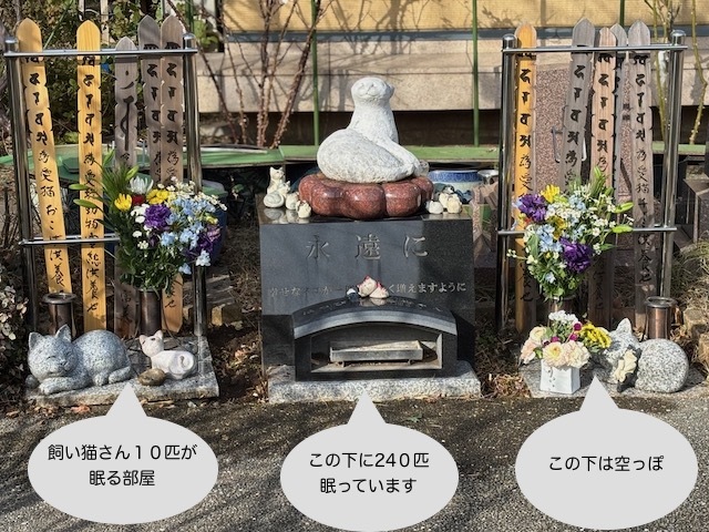 これが私が看取った240匹が眠る猫専用供養碑です。飼い猫さんも眠っています。