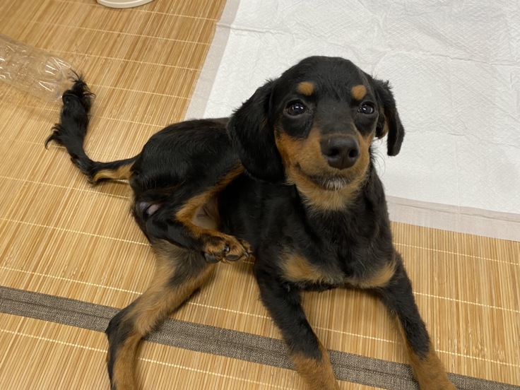保護した当時は毛がほとんど抜け落ちてしまいましたが、学生の懸命なケアで今ではこんなにきれいになりました。ご実家で、犬9匹・猫7匹といっしょに楽しく暮らしています。