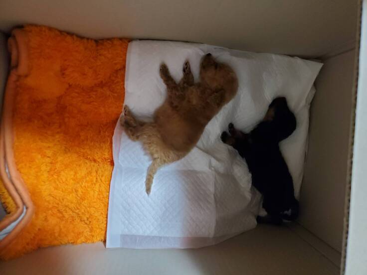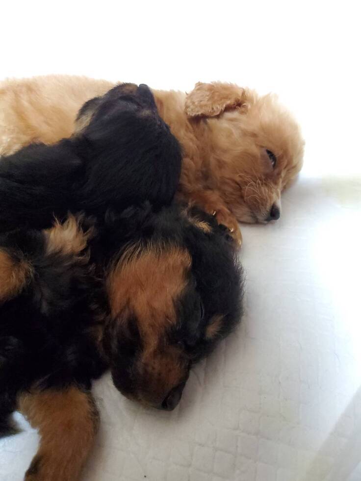 画像左の子はアンバーと名付けられ、学生の家族となって先住わんちゃんたちと一緒にしあわせに暮らしています。