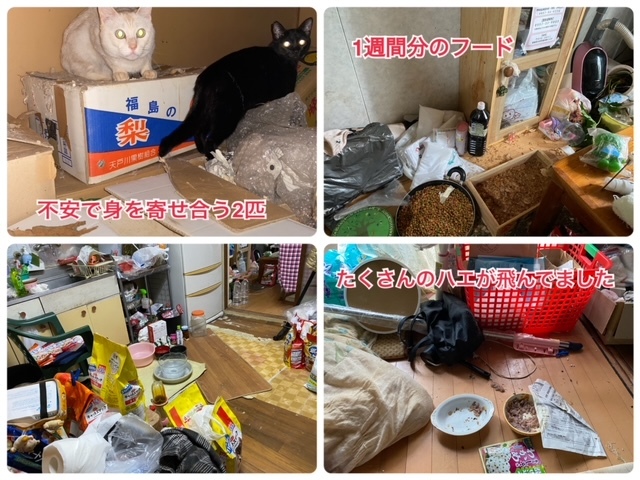 ご友人が隣の市から猫の世話に通っていましたが、ご友人も持病の悪化で通うことが難しくなりました。週に1回、猫たちのご飯とトイレ掃除に通っていましたが、その頻度では清潔な状態を保つことができません。一週間分のフードをおいていました。トイレは一つしかなく、週一回の掃除です。当然トイレ以外でトイレをしていました。エアコンはなく締め切った部屋には悪臭が充満するようになり、近所からクレームがきていたようです。