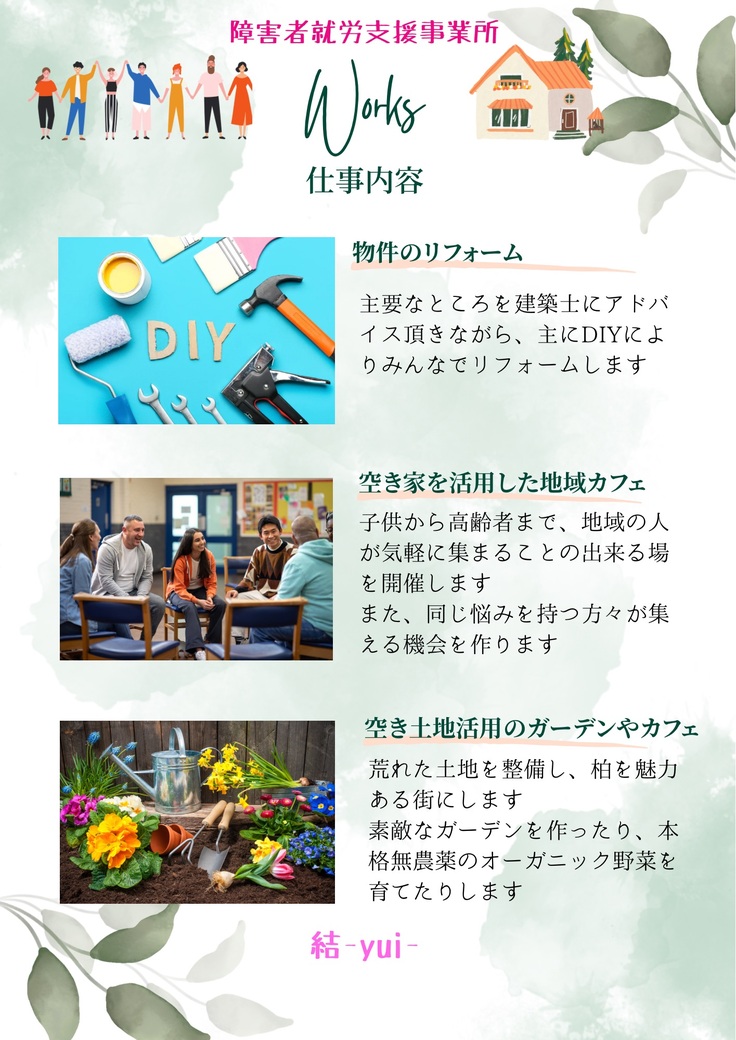 このようなことのある社会に危機感をもち当事者として声をあげるべく、退職し、NPO法人結-yui-設立と障害者就労継続支援B型の立ち上げを決意。