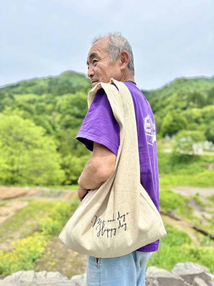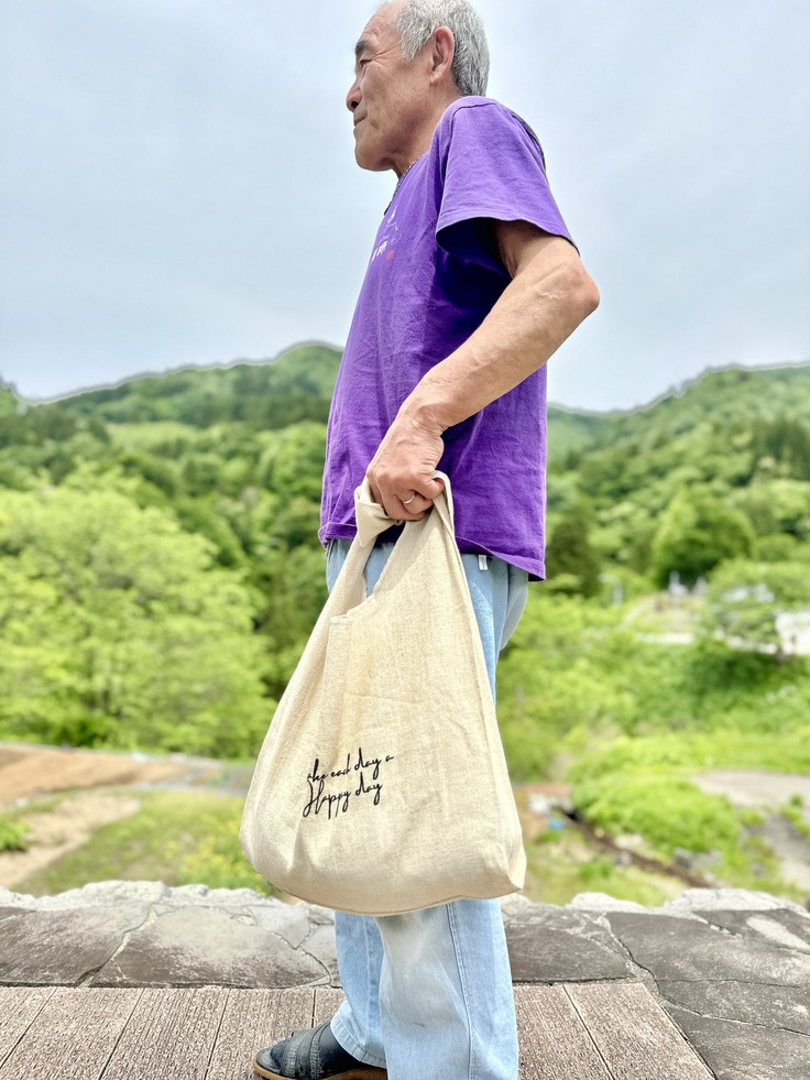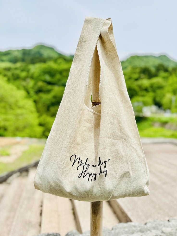を刺繍で入れた麻と綿の混合素材のトートバッグです。