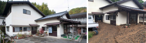 (右)土砂の押し寄せた窯元の様子。奥にガス窯が土に埋まっているのが見えます。