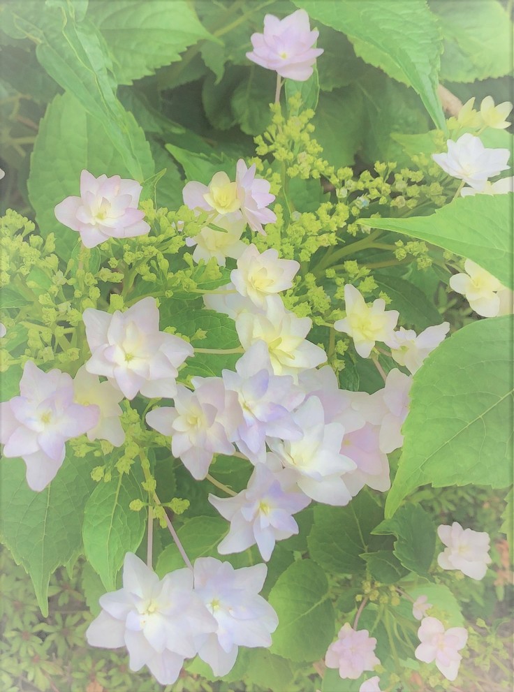 こちらは仮住まい園舎の玄関です。ガクアジサイ?