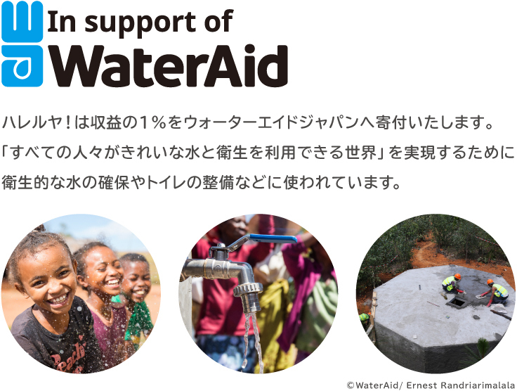 4:ハレルヤの収益の1%を「すべての人々がきれいな水と衛生を利用できる世界」を目指す、ウォーターエイドジャパンに寄付いたします。
