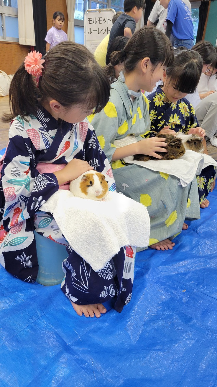 慣れた手つきでモルモットをなで、顔を愛おしそうに眺める女の子もいれば、出番を待っているモルモットの群れを興味深く観察する男の子もおり、それぞれのペースで動物と親しむ姿がとても印象的でした。