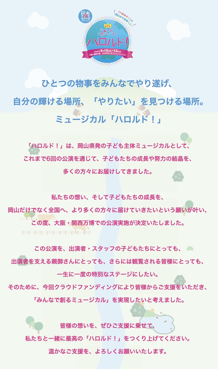 立場の違う大人たちが、一丸となって未来ある子どもたちを応援できる場を岡山につくり、子どもたちを輝かせたい。そんな想いから岡山子ども未来ミュージカル「ハロルド!」が生まれました。 「ハロルド!」は出演者を岡山県内の子どもたちから公募し、プロと共にひとつの目標に向かって力を合わせる、地域文化創造プロジェクトです。 このミュージカルを通じ、子どもたち自身の「やりたいこと」を見つけるきっかけにしてほしいと考え、2018年の初演から現在まで全6回の公演を続けてきました。 第7回となる今回は、子どもたちの成長する姿をより多くの方々に届けたいと考え、大阪・関西万博での公演が決定しました。 この「ハロルド!」が日本の未来を担う「人」を育て、岡山で脈々と受け継がれていく「文化」となり、地域に根付いた取り組みとなることを目標に、今後も歩み続けていきます。 皆様の温かいご支援とご協力を心からお待ちしております。