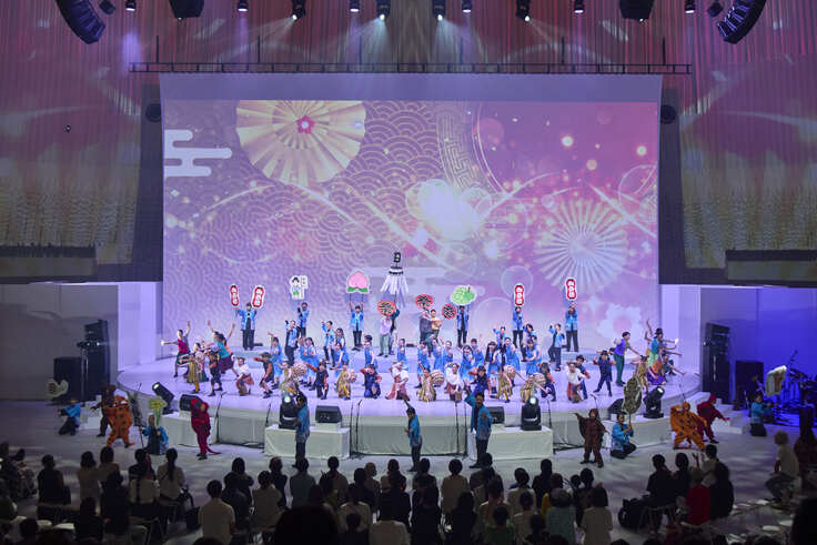 大阪・関西万博のテーマである「いのち輝く未来社会のデザイン」のもと、いのちを育み、いのちを磨き、いのちを響き合わせ、小学3年生~高校3年生78名の子どもキャスト、スタッフで一つの舞台をつくり上げました。