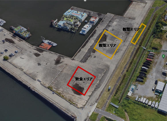 土浦新港の上空からの写真のように、観覧エリアと飲食エリアを設置します。観覧場所は、コンクリートの広場か後方の土手になります。ご支援いただいた方は、このエリアに入ることができます。