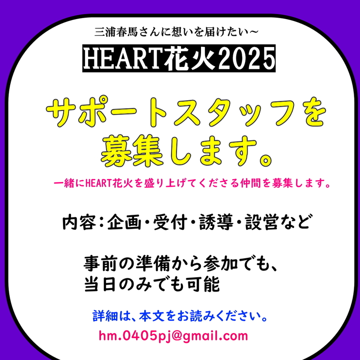 興味のある方、やってみたい方、HEART花火のメルアドまでお知らせください。