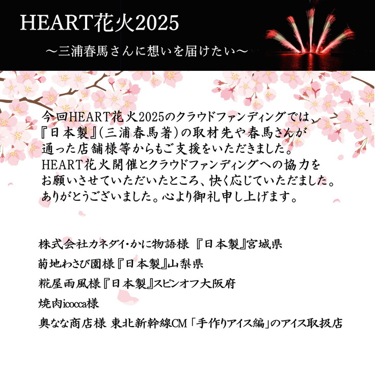 今回HEART花火2025のクラウドファンディングでは、『日本製』(三浦春馬著)の取材先や春馬さんが