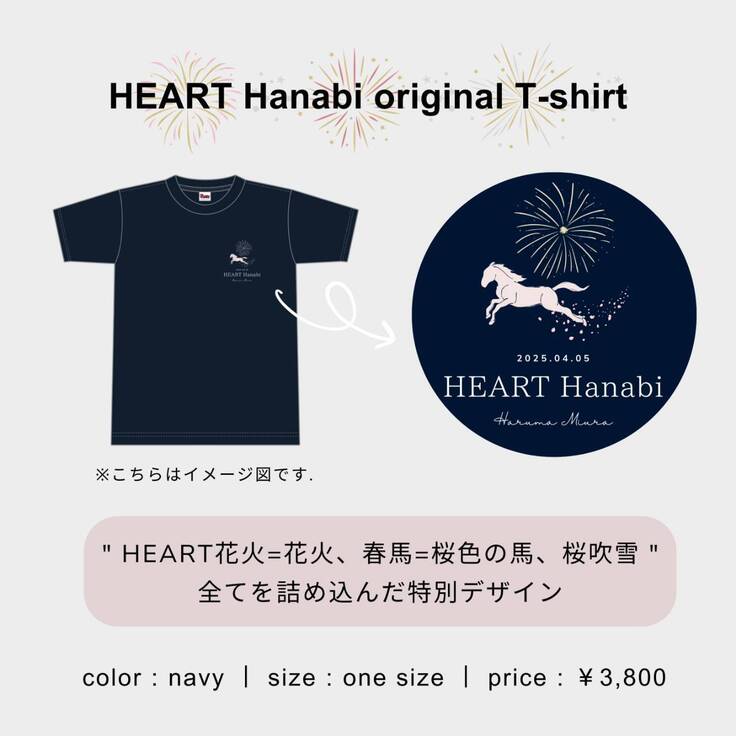 春馬さんとHEART花火のスペシャルコラボ、力強い馬と花火と桜をイメージしたネイビーカラーと、春馬くんの名前と誕生日をシンプルにデザインしたホワイトカラーをご用意しました。
