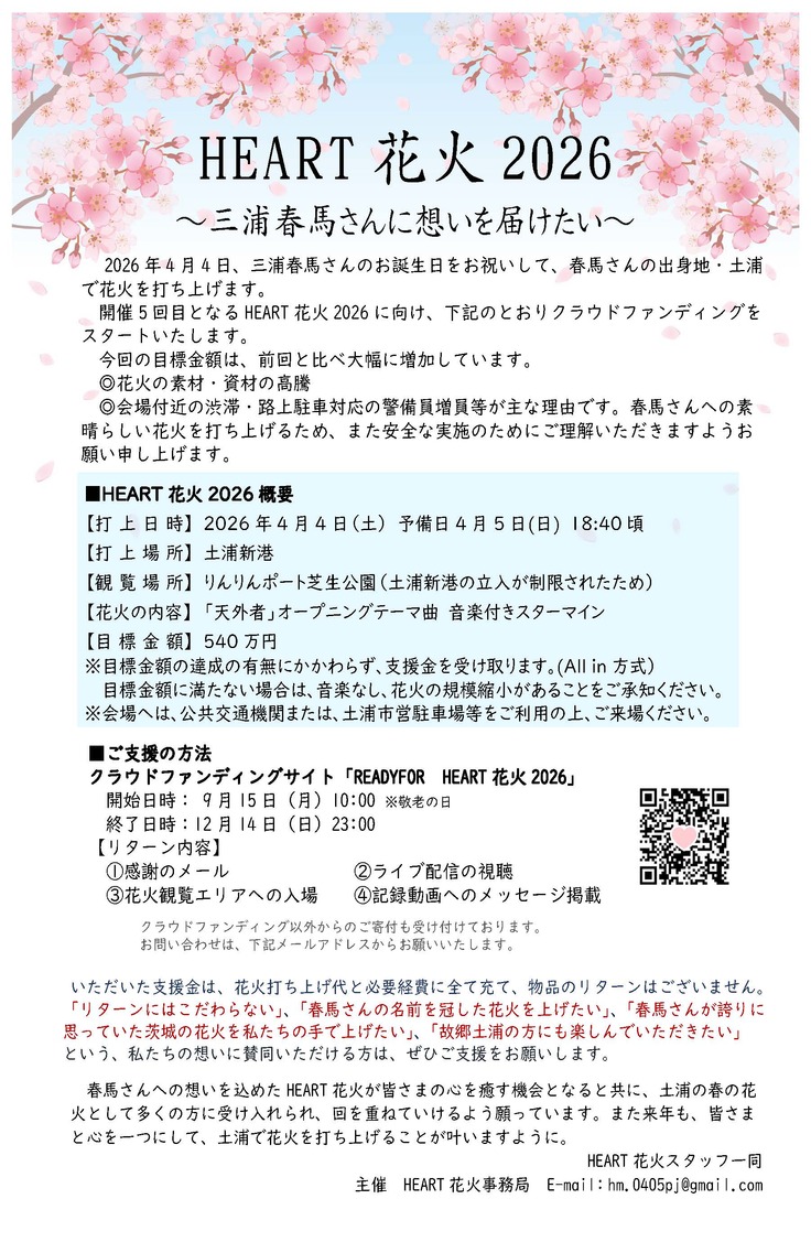 9月15日(10:00)より、『HEART花火2026』のクラウドファンディングの募集がスタートします。また是非ご賛同いただきますようお願い申し上げます。