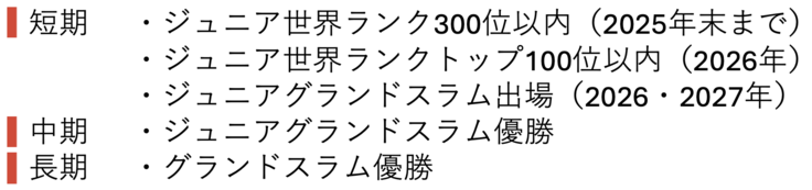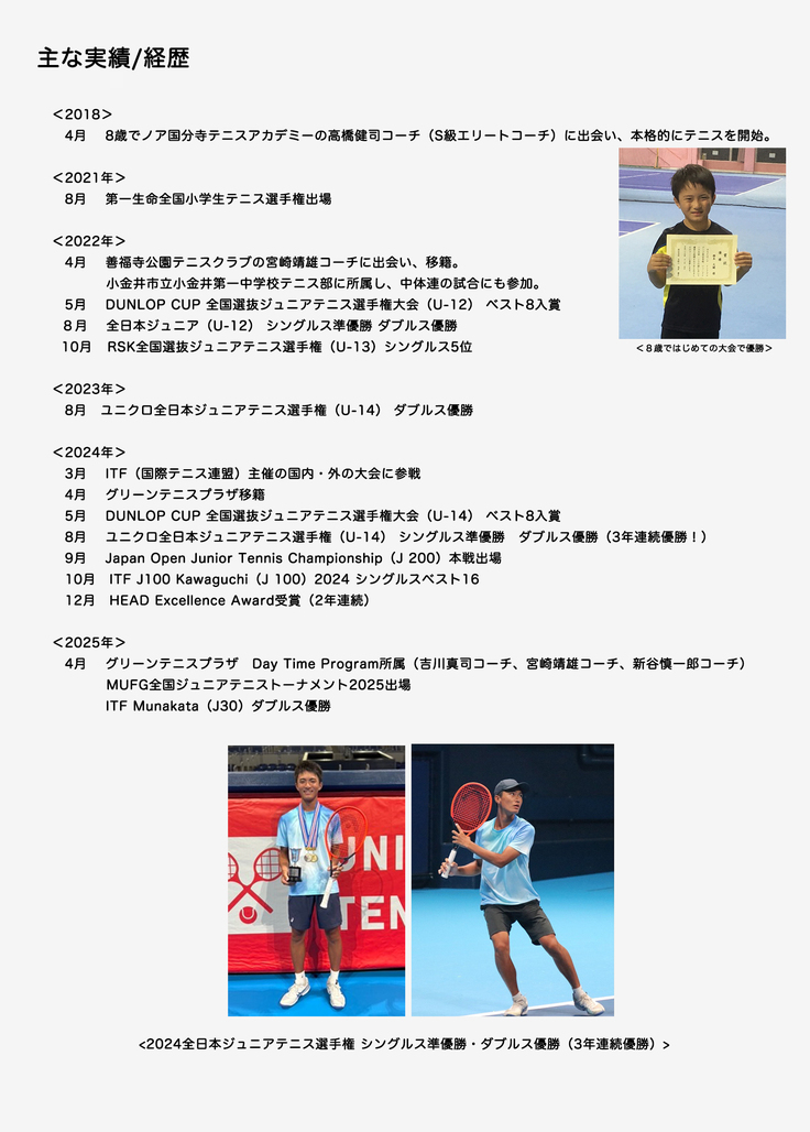 現在は、グリーンテニスプラザ(埼玉県川口市)の プロ養成のための「Day Time program」に所属し、毎日、夢であるグランドスラム(年4回の世界トッププロの大会)優勝に向けて練習や試合に 励んでいます。