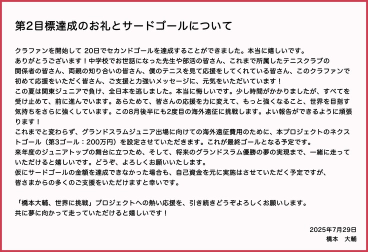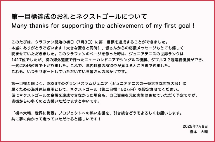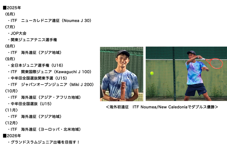 本プロジェクトは、グランドスラムジュニア出場に必要な世界100位以内を目指すための海外遠征費のサポートをお願いするためです。僕の夢の第一歩を応援してください。皆さんの力を貸してください。ぜひ、熱い応援をよろしくお願いいたします!