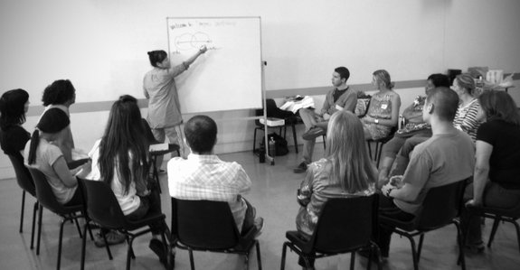 非言語的なコミュニケーションを活性化するものとして、いま教育の分野で注目を浴びているのがインプロです。インプロとはインプロヴィゼーションの略で、即興という意味を指します。このインプロには即興劇と応用インプロの2種類あり、前者は芸術で後者は教育の分野です。わたしが取り組んでいるのは後者です。応用インプロでは、ある動作をみんなで回して順々にやっていくことや、動作を回しながら変化させていくことなどを行います。非日常性が高く、普段使わない部分の脳の機能を使用するのではないかと、コーチング分野などでも注目されています。発達障害の当事者たちがインプロのスキルを学ぶことができたら、このように、メタ認知やマインドフルネスに刺激を与えることになり、その場の変化に気づきやすくなり、社会生活にいい影響がでてくると考えます。発達障害の当事者は、この能力がたいてい低く困難を抱えているのです。