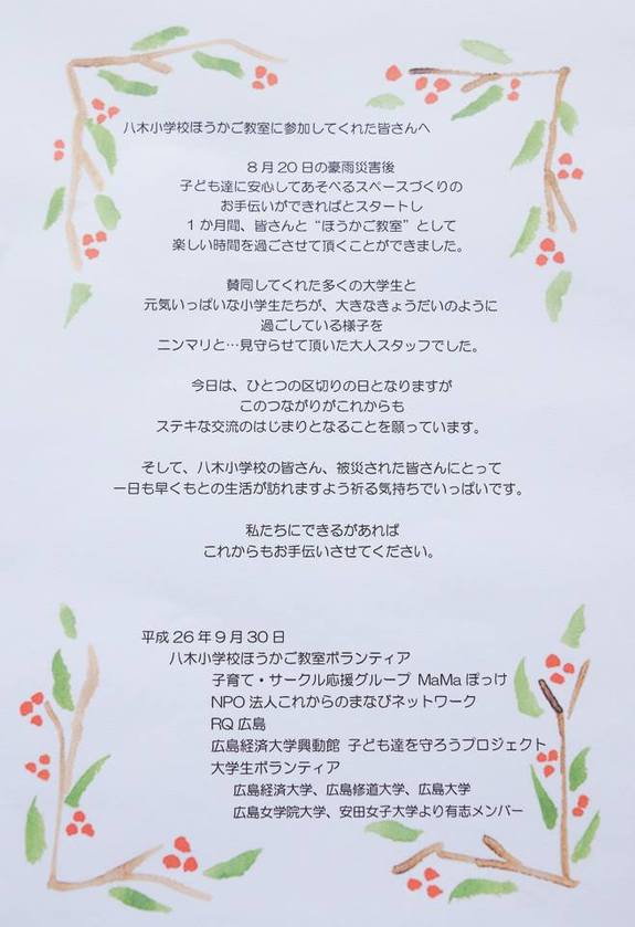 この広島の土砂災害の被害地区にある八木小学校にて「ほうかご教室」という子どもと触れ合うというボランティアに関わらせて頂きました。その八木小学校で、グラウンドが一部駐車場、体育館がボランティアの方々の中継点となっており、常に車の往来がある状態を目の当たりにしました。そういった中で、子ども達の遊ぶスペースが奪われました。
