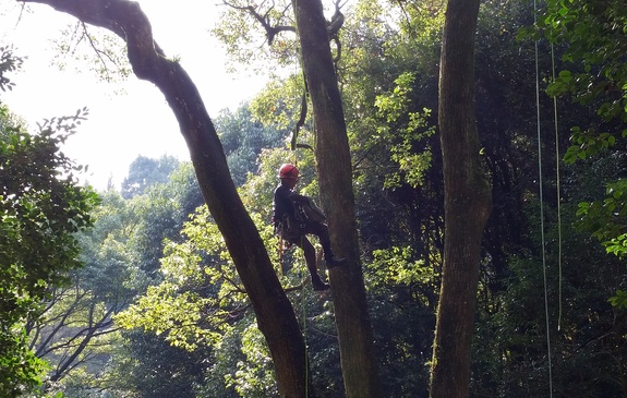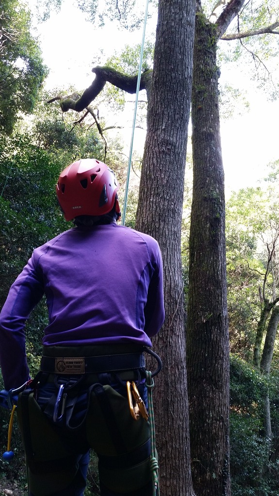 (枯れ枝を実際に登って切っています)