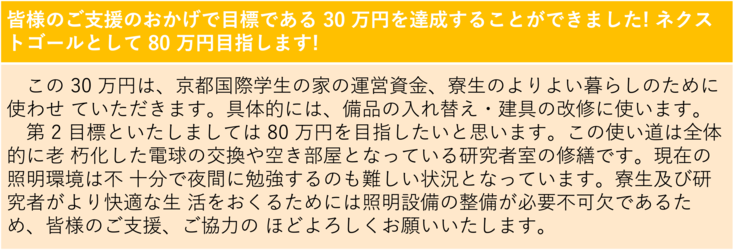 詳細:コロナ禍により寮生が減少し赤字のため、資金を募り、京都国際学生の家の継続運営を行う。