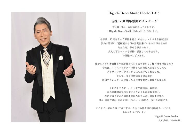 そしてクラウドファンディン達成に伴い、Higuchi Dance Studio HideboHより感謝のメッセージが届きましたのでこちらでお送りさせて頂きます(^^)