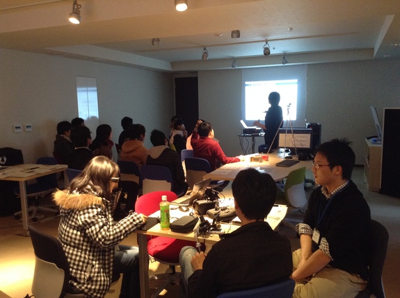 (2014年12月14日ヘッドマウント型ディスプレイのソフト開発レクチャーの風景)